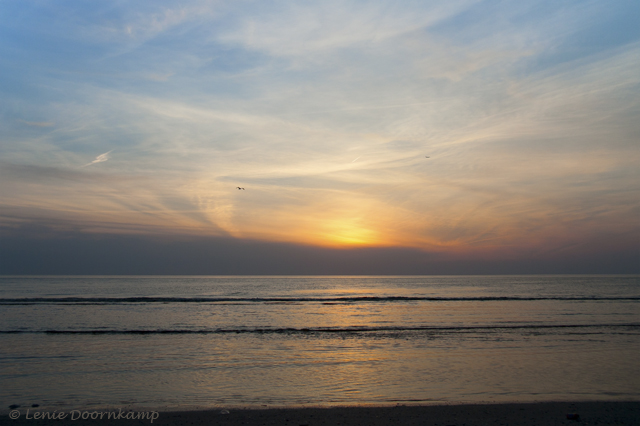 Als je aan zee bent, dan wil je natuurlijk graag een mooie zonsondergang zien. Maar het is nu eenmaal niet altijd mooi helder in de lucht op momenten dat jij dat graag wilt. Daarom heb ik gewacht op een moment dat er vogels voorbij vlogen. Maar er waren ook een paar meisjes met elkaar aan het klieren en die heb ik er toen bij op gezet. Ik vind zelf dat het de foto net even wat meer inhoud geeft dan zonder die meisjes. “Kijk en vergelijk”…